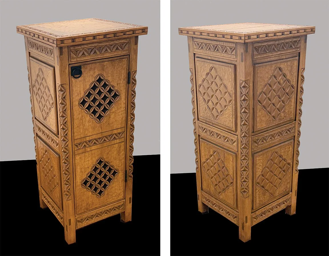 Andrew Garcia is a Spanish colonial style woodworker from Peñasco, New Mexico. A lifelong resident of northern New Mexico, Garcia appreciates the culture and art of the area, particularly the woodworking. After his retirement in 2000, Garcia juried into the prestigious Spanish Colonial Spanish Market in Santa Fe. During 24 years as a market artist, Andrew has received numerous awards, including two Best of Show awards at Spanish market. Garcia’s work incorporates very detailed carvings of both traditional and universal motifs. Garcia is inspired by the beauty of Works Progress Administration–era furniture, along with his commitment to keeping the tradition alive.