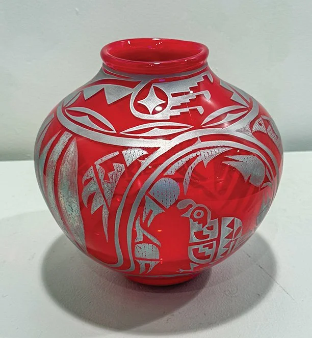Born in Albuquerque but working out of Pojoaque, New Mexico, Ira Lujan (Taos/Ohkay Owingeh Pueblo) was first introduced to glassblowing in Taos, where he apprenticed with glass artist Tony Jojola (Isleta Pueblo). Working with Jojola opened Lujan’s eyes to combining Pueblo themes and subject matter with the ancient art of glassblowing. To create his work, Lujan, who also studied under Preston Singletary (Tlingit) at the Pilchuck Glass School, uses the ancient techniques passed down from Italian glass blowers. Today, Lujan is known for glass chandeliers, Pueblo pottery-inspired vessels, and totem poles, all influenced by and responding to everyday themes in contemporary Native America. He notes that teaching and collaborating with other Native glassblowers has inspired his own practice, and his integration of Pueblo culture into the art of blown glass “reflects a visual language that I have connected to.”