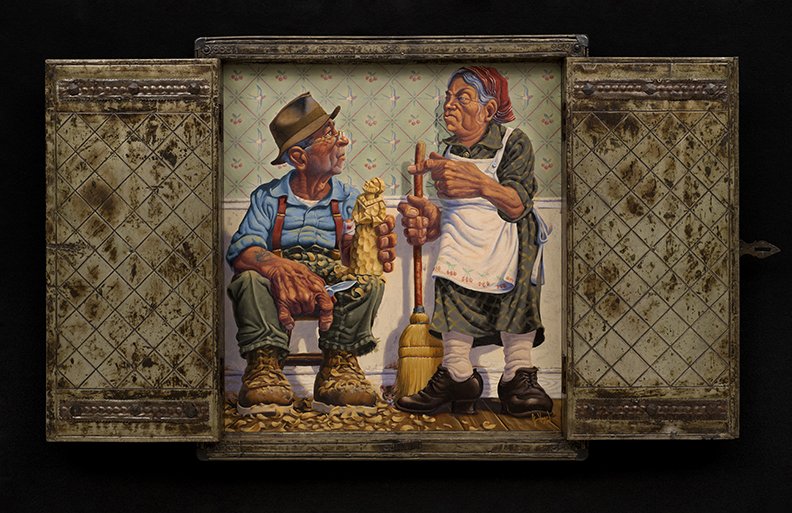 Growing up as the self-professed “weird art kid” in Roswell, New Mexico, Jim Vogel comes from a family of storytellers, a background that now pervades his own artwork. At home in the heart of New Mexico, Vogel paints scenes of New Mexican myth and folklore in an attempt to “put images to these stories I’ve heard over and over from my mother and father.” Reminiscent of Thomas Hart Benton’s social realist and regionalist works, Vogel’s narrative paintings feature frequently New Mexico’s working-class and rural poor in an attempt to relate the common man’s struggle. In addition to his paintings, Vogel and his wife, Christen, create elaborate, handmade frames to enhance his scenes. Based in Dixon, New Mexico, Vogel participated recently in “Taos Six Collection: An Homage to Joseph Henry Sharp” at the Blue Rain Gallery, in which he showed his work Matching the Color of Sangre de Christo, after Joseph Henry Sharp’s The Old Santos Mender.